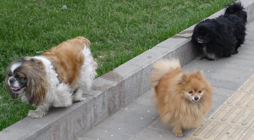 I was walking down the street and passed a woman out walking her three dogs. There are an abundance of small spaniels, pekinese and pomeranian type compact pooches here. Considering the small living quarters and tiny court yards in the hutongs (older Chinese neighborhoods) it makes perfect sense and evening dog walking is a common site.